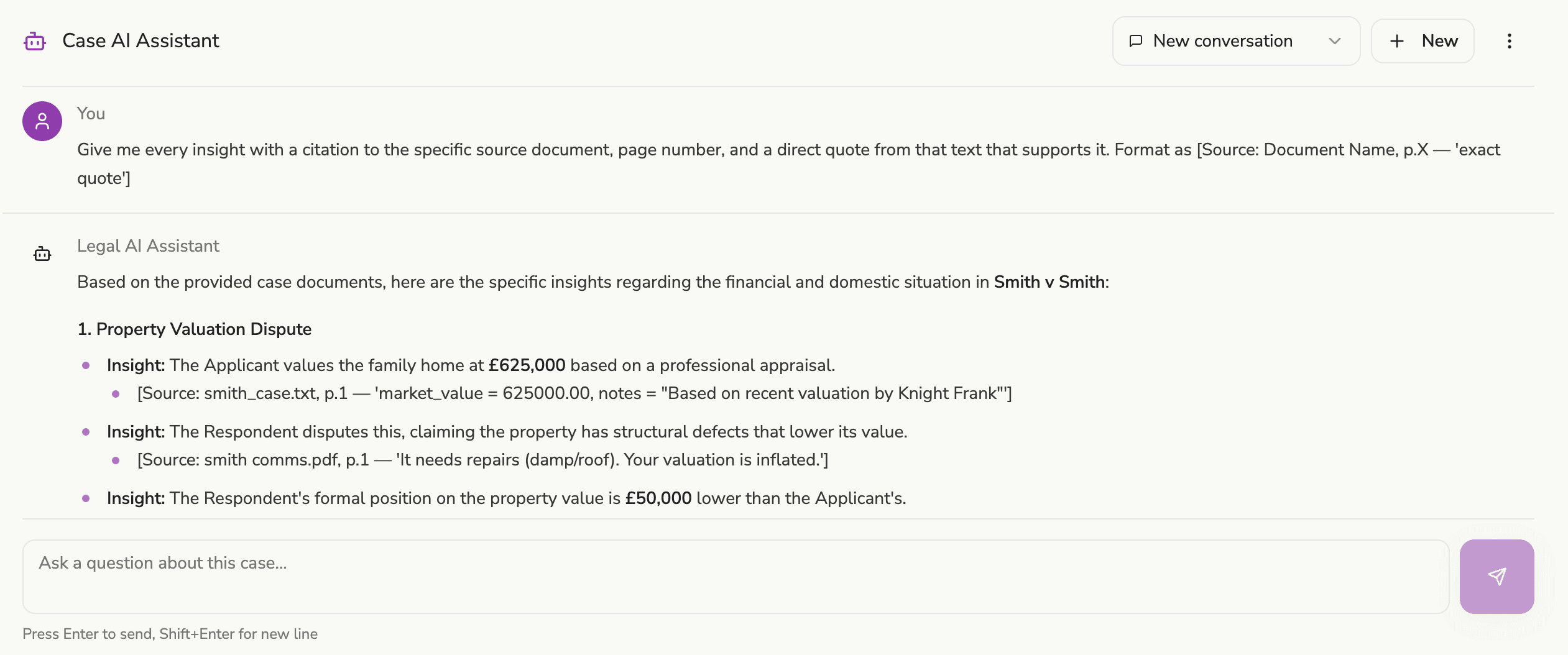 Pivot ingests everything in your case file - both structured and unstructured material - including PDFs, WhatsApp conversations, emails, bank statements, Word documents, images, and other standard formats. We transform it into a constructed case map that can be queried to surface insights, inconsistencies, gaps, and risks, with precise citations back to source documents including page numbers, timestamps, and context.
