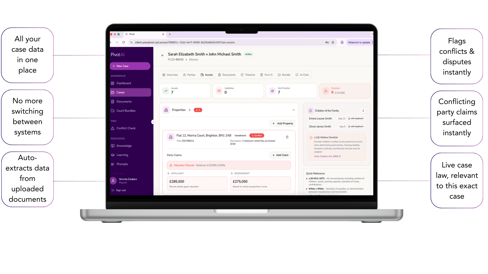 Pivot is built on a fundamentally different architectural foundation. Unlike general AI tools that use keyword search and probabilistic text matching, Pivot uses ontology-grounded knowledge graphs that understand the structural relationships in family law - how parties, claims, assets, and conflicts relate to each other. This means the system recognises that "market value," "worth," and "valuation" are structurally the same concept, enabling deterministic conflict detection rather than simple text matching. You can query the system with questions like "show claims lacking required evidence by claim type" or "have there been issues with handovers" and receive structured, cited answers. We also provide strict data security with UK-based storage, maintain legal professional privilege, and transform case materials into court-ready work product including PD27A-compliant court bundles.