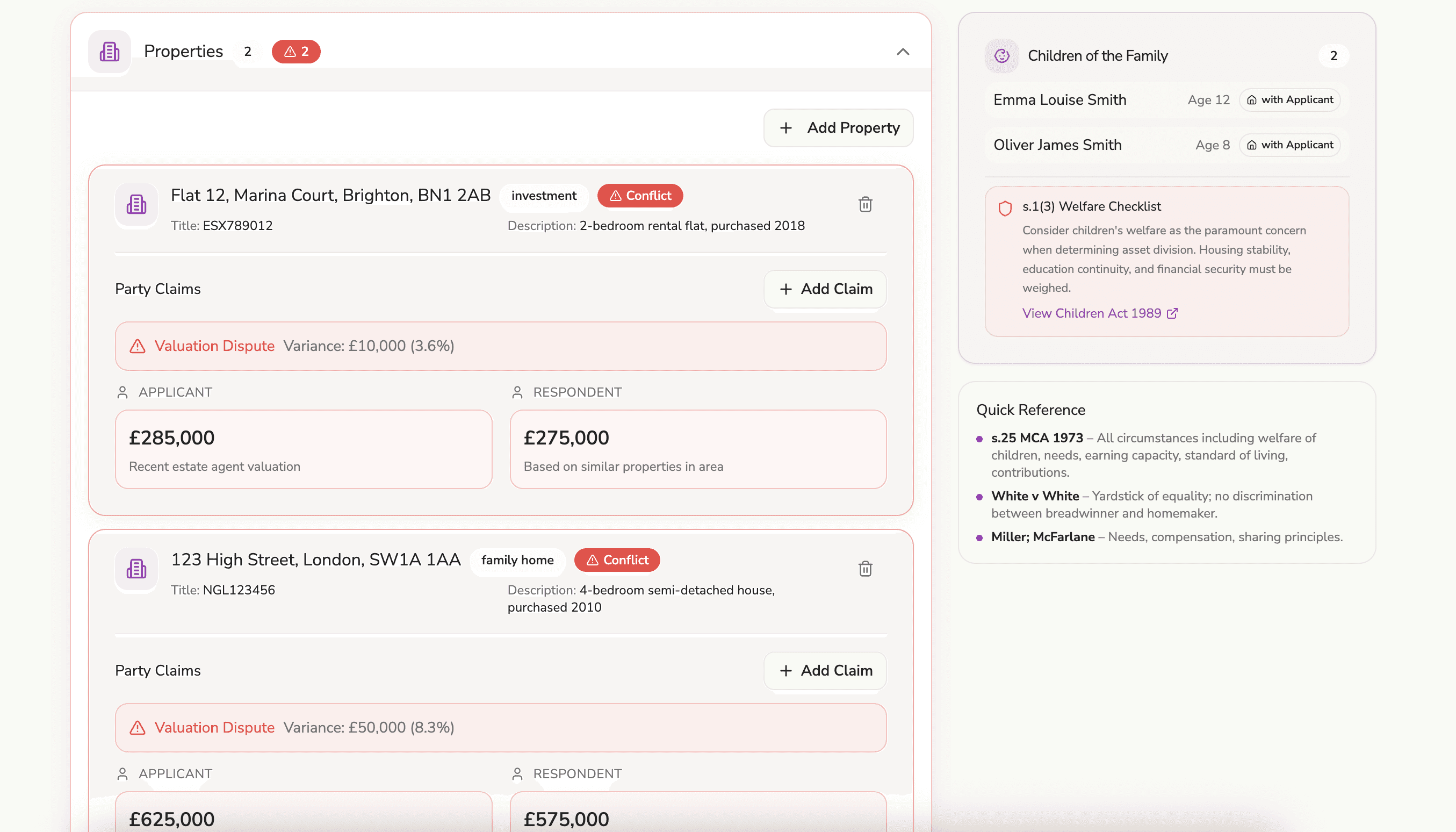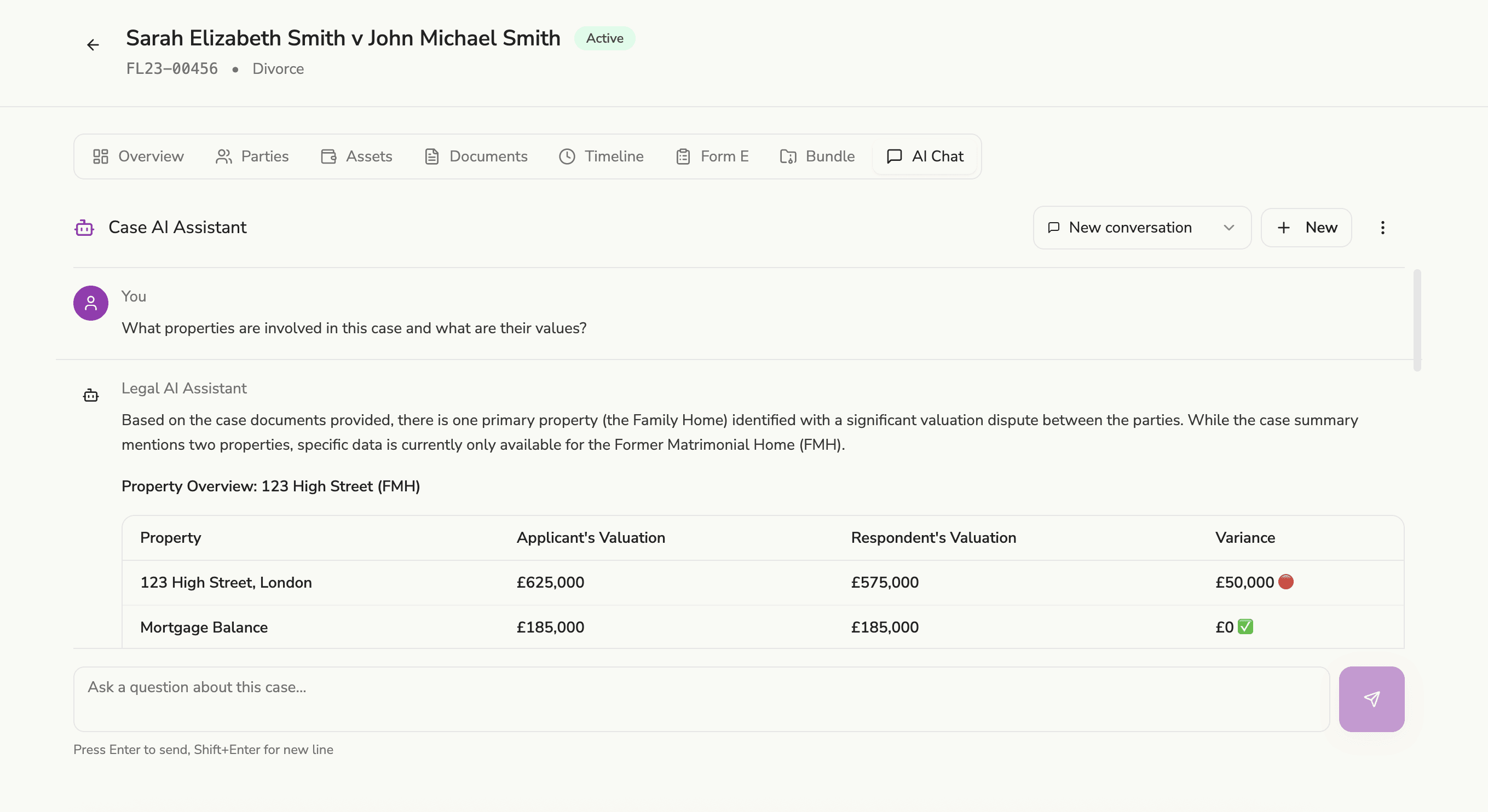 Absolutely. The platform is specifically designed for the complexity of family law matters, including financial remedy cases with multiple parties, contested children matters, and complex asset tracing scenarios. Our system can detect conflicts and discrepancies across multiple parties' documents.